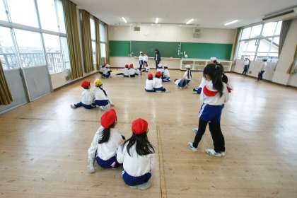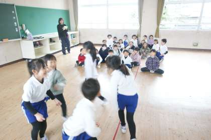 写真下…1年2組、体育「ひょうげんくいず」遊びです。
