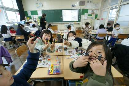 写真中…1年2組、図工「すきまちゃん」づくりの学習です。