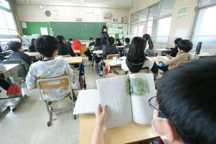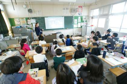 写真下…4年3組、国語「世界一美しいぼくの村」の学習です。