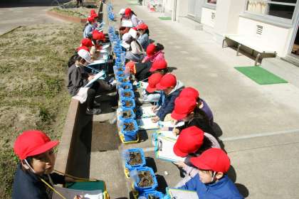 写真上…1年1組、生活科「チューリップの観察」の学習です。
