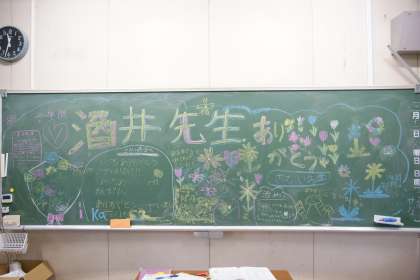 黒板には子どもたちのメッセージが書かれています。