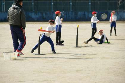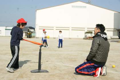 写真上・中…3年生は、体育で「ティーバッティング」に挑戦しました。