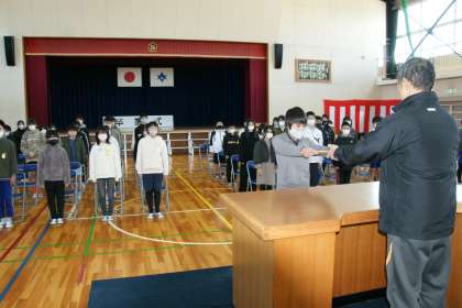 写真下…最後の練習では、6年生から私(校長)と教務主任(写真)に「手紙」と「言葉」をいただきました。