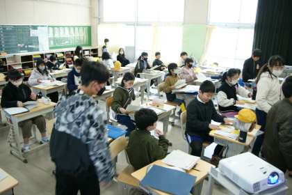 写真下…5年2組、学級活動の時間です。