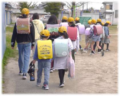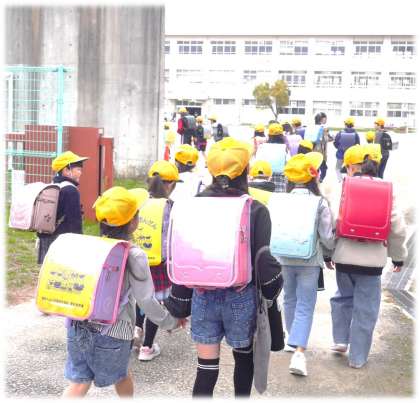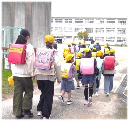 今日から1年生と一緒に登校です。お兄さんやお姉さんと手をつなぎながら、にこにこ顔で歩く1年生。1年生の歩く速さに合わせる通学団の2年生から6年生。それぞれの姿を愛おしく感じます。