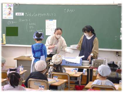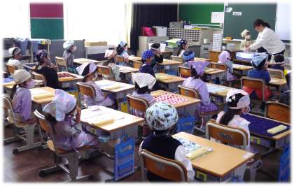 今日から1年生も給食が始まりました。担任の先生から、準備の仕方の説明を聞き、一つ一つ動きを確認していきます。