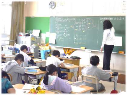 小数点の移動の規則性を例題をもとに、みんなで考えています。そして、見つけたことを算数ことばを上手に使って、まとめていきます。ノートのまとめ方も、あとで自分で見返すときに、よく分かるように工夫されています。さすが5年生!