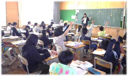 子どもたちは、学級の仲間の考えにつなげながら、自分の考えをどんどん発表していきます。そして、ここぞというとき、担任の先生が全体にもう一度、しっかり考えさせたいところを問いとして投げかけます。