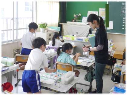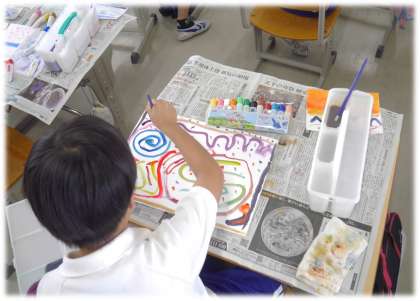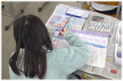絵の具の組み合わせや水の量で自分オリジナルの色をつくりだしたり、ふでの太さの違いを生かしたり、線の描き方を工夫したりして、「いいかんじ!」に仕上げていきます。制作に取り組む表情が、生き生きしています。