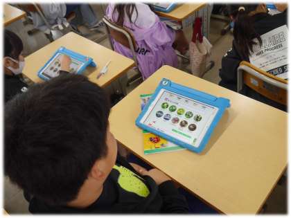 学習用タブレットで、春の生き物の確認をしています。