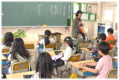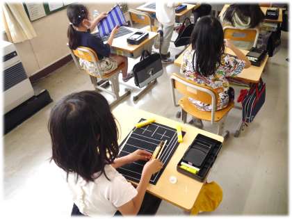 筆をさわるのもわくわく、使い終わったあとの筆を穂先に気を付けて片付けるのもどきどき。初めてのことに子どもたちの目もきらきらの時間でした。いよいよ次の時間は、実際に「書く」学習が始まります。「楽しみ〜」というつぶやきが聞こえてきて、こちらもなんだかうれしく、その時間が待ち遠しくなりました。