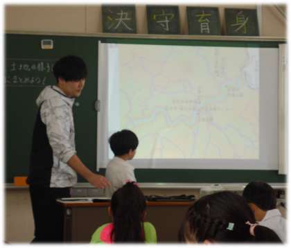 豊田市全域の地図を見ながら、見つけ学習を行っています。自分たちで駒場学区の地図を作ったことを生かして、どんどん見つけたことを学級のみんなで出し合います。