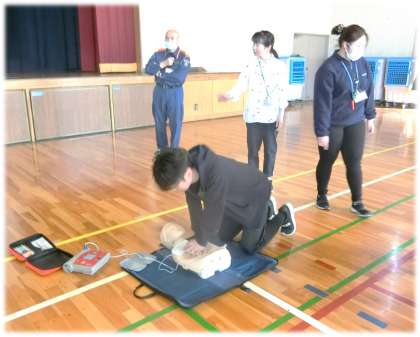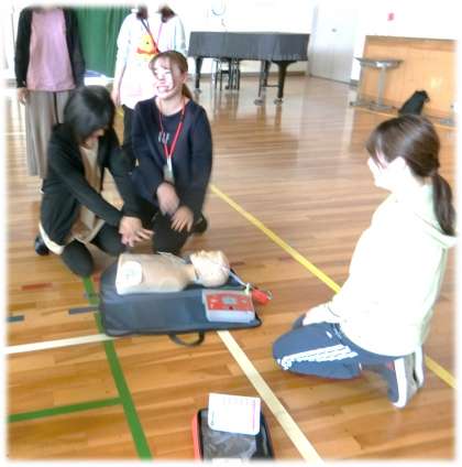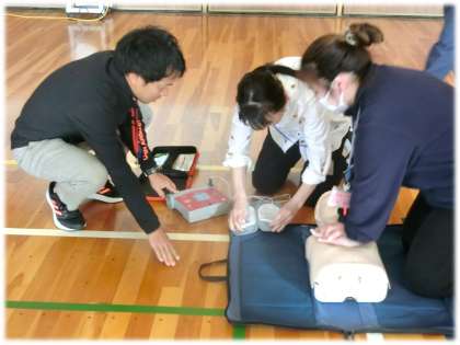 子どもたちの下校後、今度は教員が救急蘇生法について学びました。いざというとき、学校で子どもたちの一番近くにいる教員が、大切な子どもの命を守り、救うアクションができるように、毎年度実施している研修です。