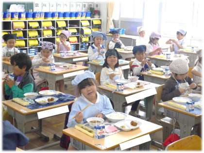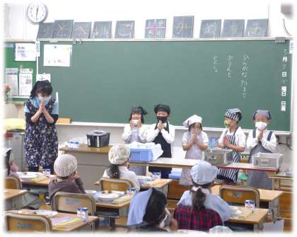 1年生も給食が始まって1か月あまり。準備の仕方も上手に、落ち着いて行っており、感心するばかりです。