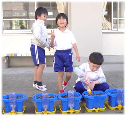 朝、登校するとすぐにペットボトルに水を入れ、大切そうに自分の鉢に水やりをする1年生の姿が見られました。