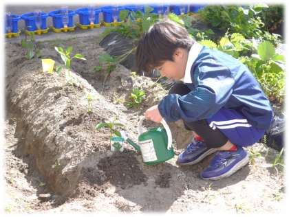畑では、自分で植えた野菜の苗に水やりをする姿が、元気タイムには、2年生が自分の鉢に植えた野菜の苗に楽しそうに、何度も水やりをする姿が見られました。(土・日曜日の分もたっぷりあげていました。)