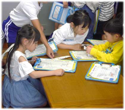 クイズに正解すると、1年生の選んだシールを探検シートにていねいに貼ってあげる2年生でした。