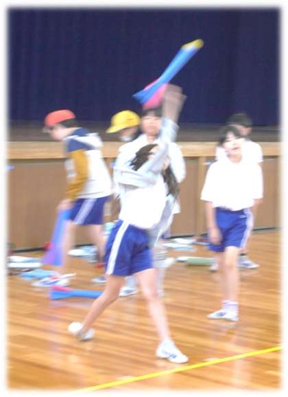 ボール投げで、ボールをより遠くにとばすための腕の使い方をロケット型の道具を使って練習しています。
