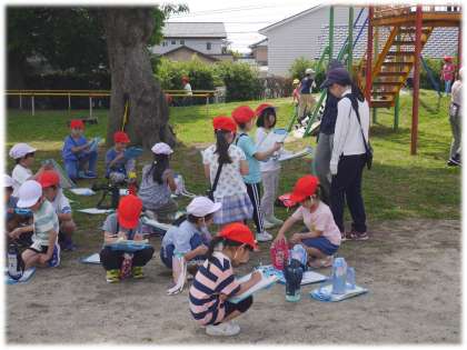 1年生は、道すがら気づいたことをまずは生活科ノートにしっかりメモを始めます。そして、遊具やかけっこで楽しく遊び始めます。