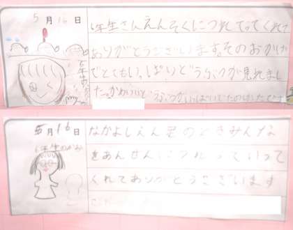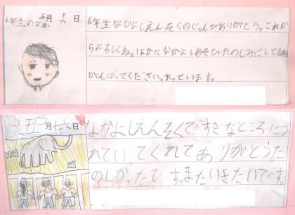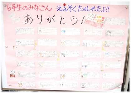 6年生の教室前のホワイドボードに、後輩たちからの「ありがとうメッセージ」が飾られていました。なかよし遠足で、自分たちのためにがんばってくれた6年生の姿を後輩たちはしっかり見ています。一人一人の「ありがとう」の気持ち、6年生にも届いたことでしょう。