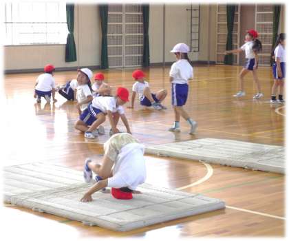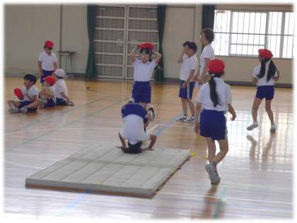 5月24日(金)2年生 体育科の授業の様子 公開日 2024/05/24 更新日 2024/05/24 各学年から 体育館から元気のよい声が聞こえてきました。2年生が、マット運動に取り組んでいます。本時では、前転に挑戦です。マットに頭のどの部分をつけると、回りやすいのか。くるっとスムーズに回るための技を何度も試しながら体得していきます。 担任の先生からアドバイスされたことを早速試してみる前向きな姿、そんな友達を応援する温かい声がけが体育館を包んでいました。 2年生