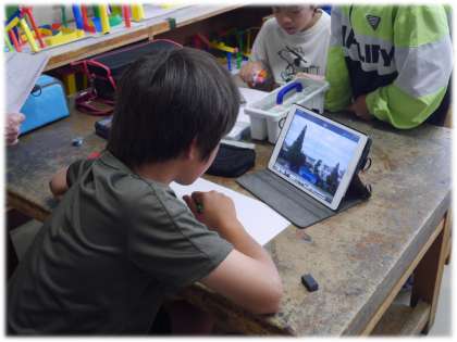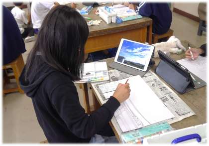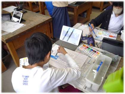 下絵を描く際には、学習用タブレットで撮影した学校のいろいろな場所の写真に構図を取りやすい線を入れたものを映し出して、遠近についても考えながらスケッチしています。