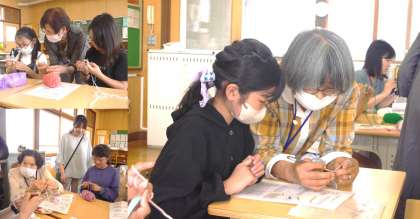 (写真中)編み物クラブ→ボランティアの方にていねいに教えてもらいながら、かぎ針編みに挑戦です。くさり編みがどんどん上手に編めていきます。