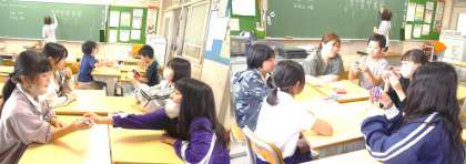 (写真上)家庭クラブ→調理実習のメニューを考え中!「何が食べたい?」「15分で作れるものには何があるのかな」学習用タブレットで検索しながら、メニューの候補を挙げていきます。