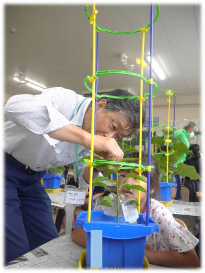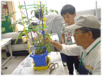 本時では、これまで自分たちで育ててきたなかから生まれた疑問「脇芽をどうしたらよいのか」「(鉢から)はみ出している部分をどうすればよいのか」を中心に教えてもらいました。