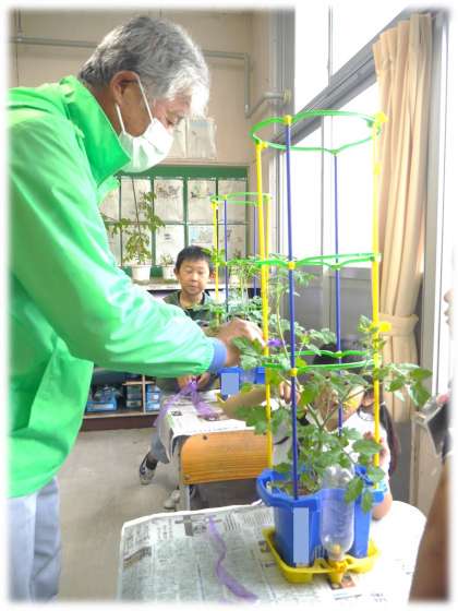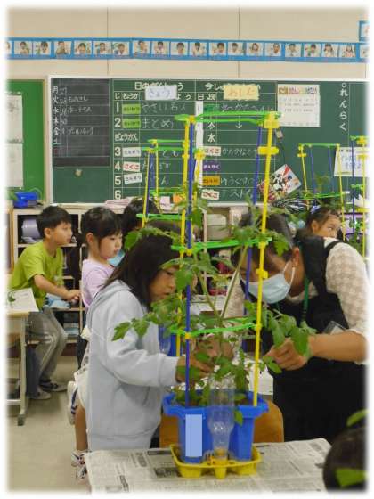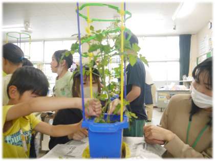 実際に、脇芽を摘む場面では、どうしてその対応が必要なのかも教えてくださり、「おいしい実がなるために必要なんだなあ」と、子どもたちは摘んでしまった部分を残念に思いながらも、自分の野菜が大きくなっていくためい必要な対応であることに納得していました。