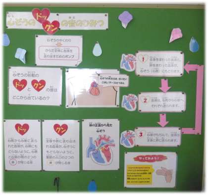 6月3日(月)保健室前の掲示 その2 公開日 2024/06/03 更新日 2024/06/03 各学年から 「心ぞうのドックンの音のひみつ」と題し、「ドッ」と「クン」の違いが分かりやすく解説されています。早速、興味深そうに掲示物に見入る高学年の姿もありました。 今月の学校公開日に、ぜひ保護者の皆様も保健室前の掲示板もご覧ください。