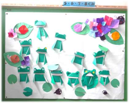 一人一人が6月を彩るように、色紙でカエルを作り、まるで「かえるの合唱」のようになかよく並んだ掲示物に仕上げました。よく見ると、表情にそれぞれのらしさが出ていて、本当にすてきです。この掲示板の前を通るたび、これから始まる梅雨も楽しみになるような、明るい気分にさせてもらえる作品です。