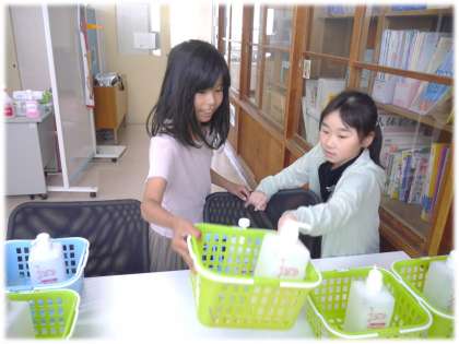 朝、各学級の保健委員が保健室にフッ素セットを取りに来ます。