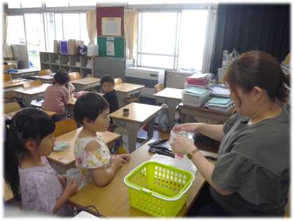 教室では、担任が一人一人の子どもたちのコップに分量の洗口液を入れ、準備万端。