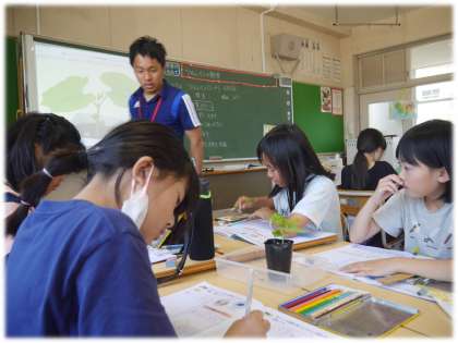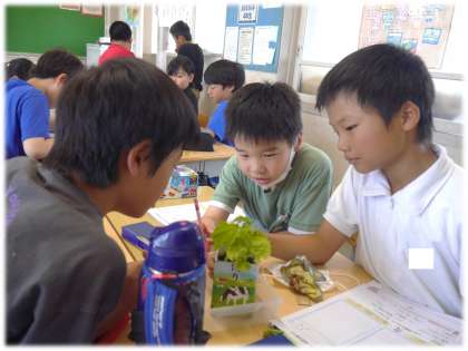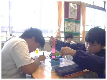 6月5日(水)4年生 理科の授業の様子 公開日 2024/06/05 更新日 2024/06/05 各学年から 自分たちで育てているツルレイシの観察です。 目でじっくり見て、葉の形の違いやツルの伸び方に着目している人。実際にどのくらい育っているのか、茎の高さをものさしで測っている人。葉のにおいをかいで、「もうゴーヤの苦いにおいがする」と気づき、メモする人。「においと苦さは関係あるのかな」と新たな疑問を抱いている人。五感を使いながら、じっくりと観察する4年生です。 4年生