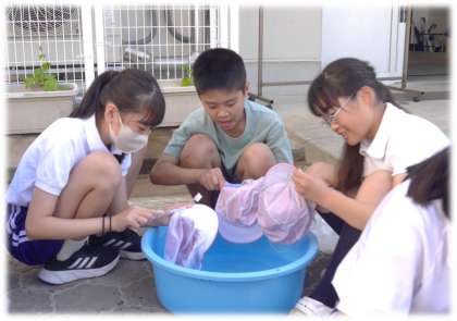 手洗いでの洗濯実習を行っています。