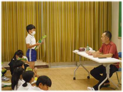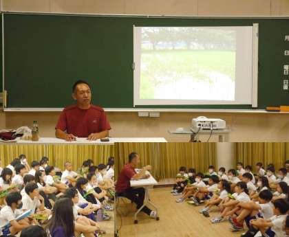 稲作づくりに取り組んでいる5年生。自分たちが植えた稲がこれからすくすく育つように、そしておいしいお米が収穫できるように探究を進めています。今日は、田植えでも助けていただいた中甲の手嶋さんを講師にお招きし、自分たちが調べた中でもさらに詳しく教えてほしいことを質問しました。