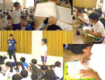 元気に育つ方法、益虫と害虫、成長の記録方法、どのような肥料が適しているのか、かかしは有効か、などなど。1時間、多くの質問にていねいに答えてくださり、5年生も教えてもらうことを聞き逃すまいとメモを一生懸命とりながら、熱心に説明に耳を傾けていました。