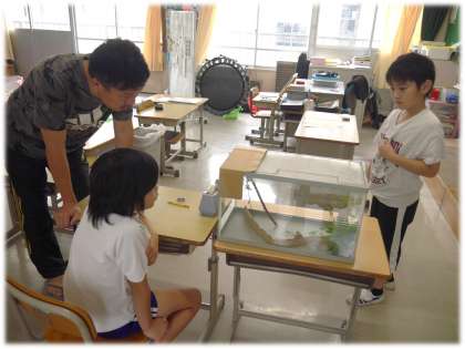 羽が傷ついたチョウのために、水槽を過ごしやすい空間にしようと大改造中。木を入れたり、とまりやすいように草を入れたりと工夫をしています。