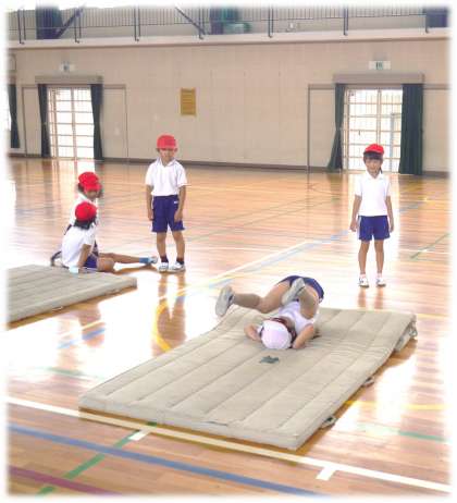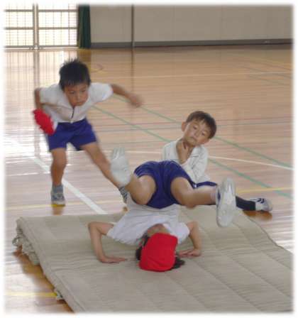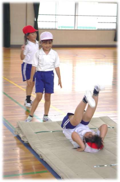 「くるんって回れるようになったから、見ていてね」そんな2年生のやる気に満ちあふれた表情にひかれ、様子を見ていると、多くの子が技を披露してくれました。最後のポーズを決めるところまで、指先まで意識して技を磨く姿に感心しました。また、自分だけではなく、友達の様子も見ながら、「さっきよりも回り方がきれいだよ」と、その子のよさに気づき、言葉で伝え合ったり、「がんばれ!いいぞ!」と励まし合ったりする姿もすてきでした。