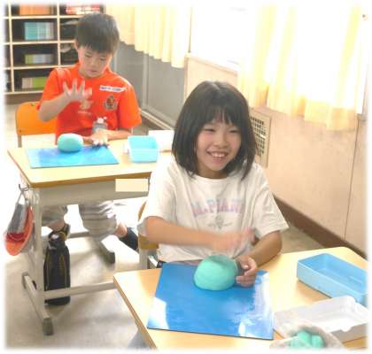 一つにまとめたねん土をイメージする家の形にしていくステップとして、だいたいの形に整えていこうと教科担任が呼びかけると、まん丸、立方体、楕円形など、一人一人が思い思いに形をつくり始めます。