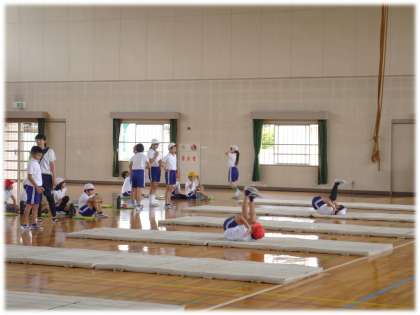 運動場では鉄棒、体育館ではマット運動に取り組んでいます。