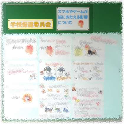 ※写真は、学校保健大会の講師の方の講演内容(プレゼンテーション)を保健委員の子どもたちが委員会掲示板に紹介しているものです。著作権の関係からぼかして掲載しています。