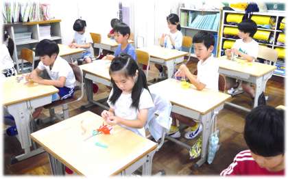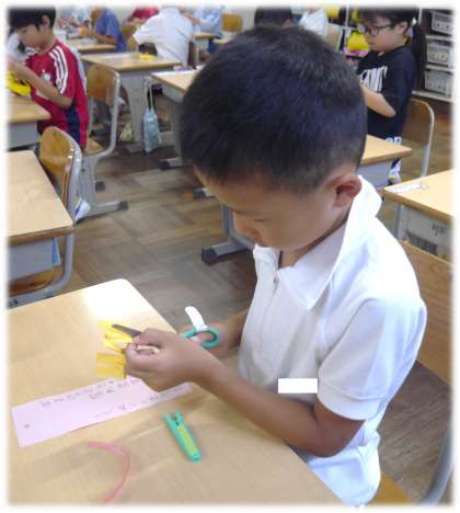 7月1日(月)1年生 学級活動の様子 公開日 2024/07/01 更新日 2024/07/01 各学年から 七夕を前に、短冊に願いごとを書いたり、飾りをつくったりしました。 魚をとるときの網をイメージした網かざりは、交互にハサミでていねいに切れ込みを入れ、ぐう〜んと伸ばしてつくりました。切る幅の違いで、一人一人の網かざりも個性が出ています。 短冊に書き入れた願いをぜひ「たぐり寄せたい」ですね。 1年生