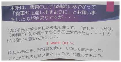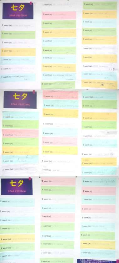 5年生の教室には、外国語科で学習した表現を使って、七夕にちなんだ願いごとの短冊が掲示されています。