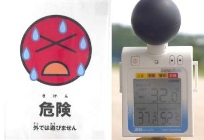 熱中症予防情報サイトでも、午前から暑さ指数が31度を超える予報でした。実際に、正午の運動場に設置している暑さ指数計では、気温が37.2度、暑さ指数(WBGT)が32度でした。吸い込む空気も暑く、重苦しく感じるほどです。