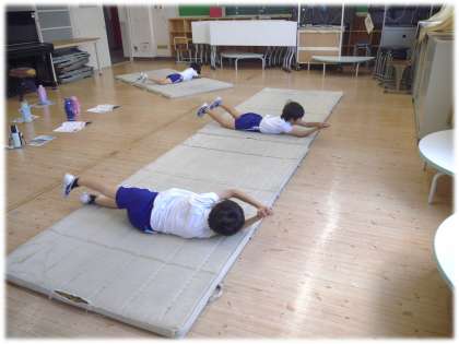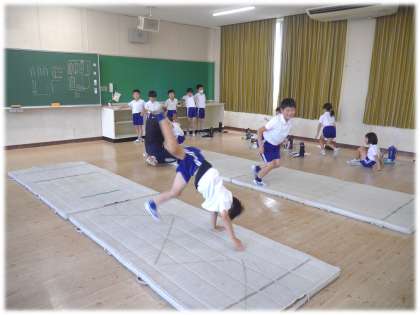 今日も朝から暑い一日となりました。楽しみにしている体育科の授業も、暑さのため運動場や体育館では心配な状況のため、2年生は若駒ルームでエアコンをきかせてマット運動に取り組んでいました。