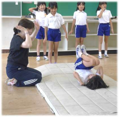 教室いっぱいにコースのように5枚のマットを敷き、それぞれに取り組む技を決め、順番に挑戦です。