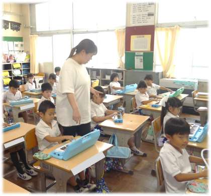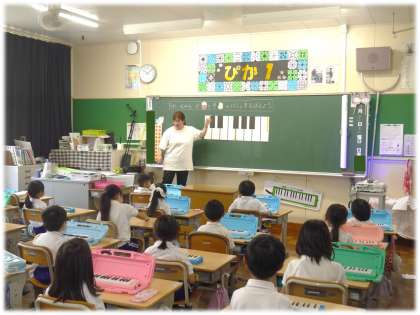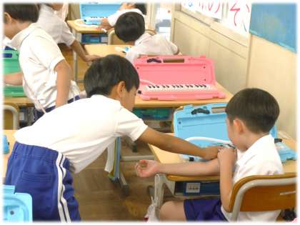 鍵盤ハーモニカを使うことを楽しみにしている1年生。棚から自分の鍵盤ハーモニカを持ってくるときも、大事そうに抱えている姿がほほえましく感じます。