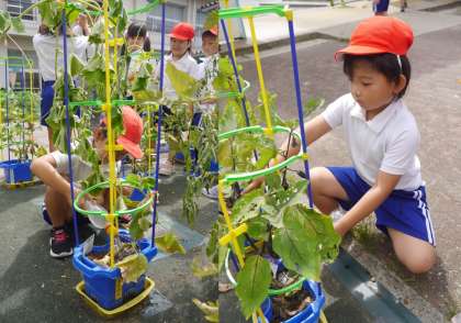 「土日と暑かったから、こんなに葉っぱがしおしおだ〜」とつぶやきながら、愛おしそうに自分の野菜に水をやる2年生。